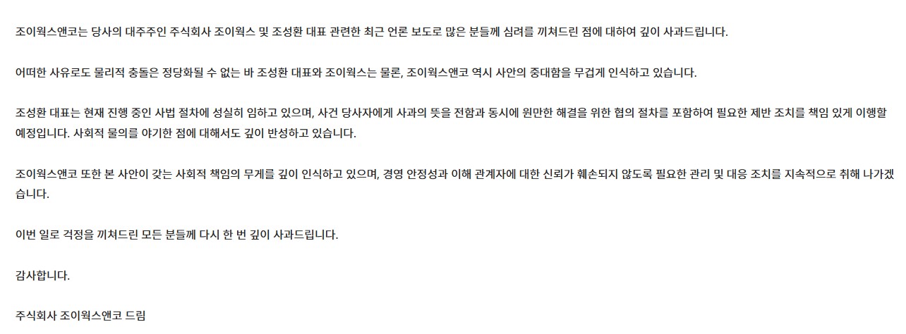 2) 조이웍스앤코 공식 입장문